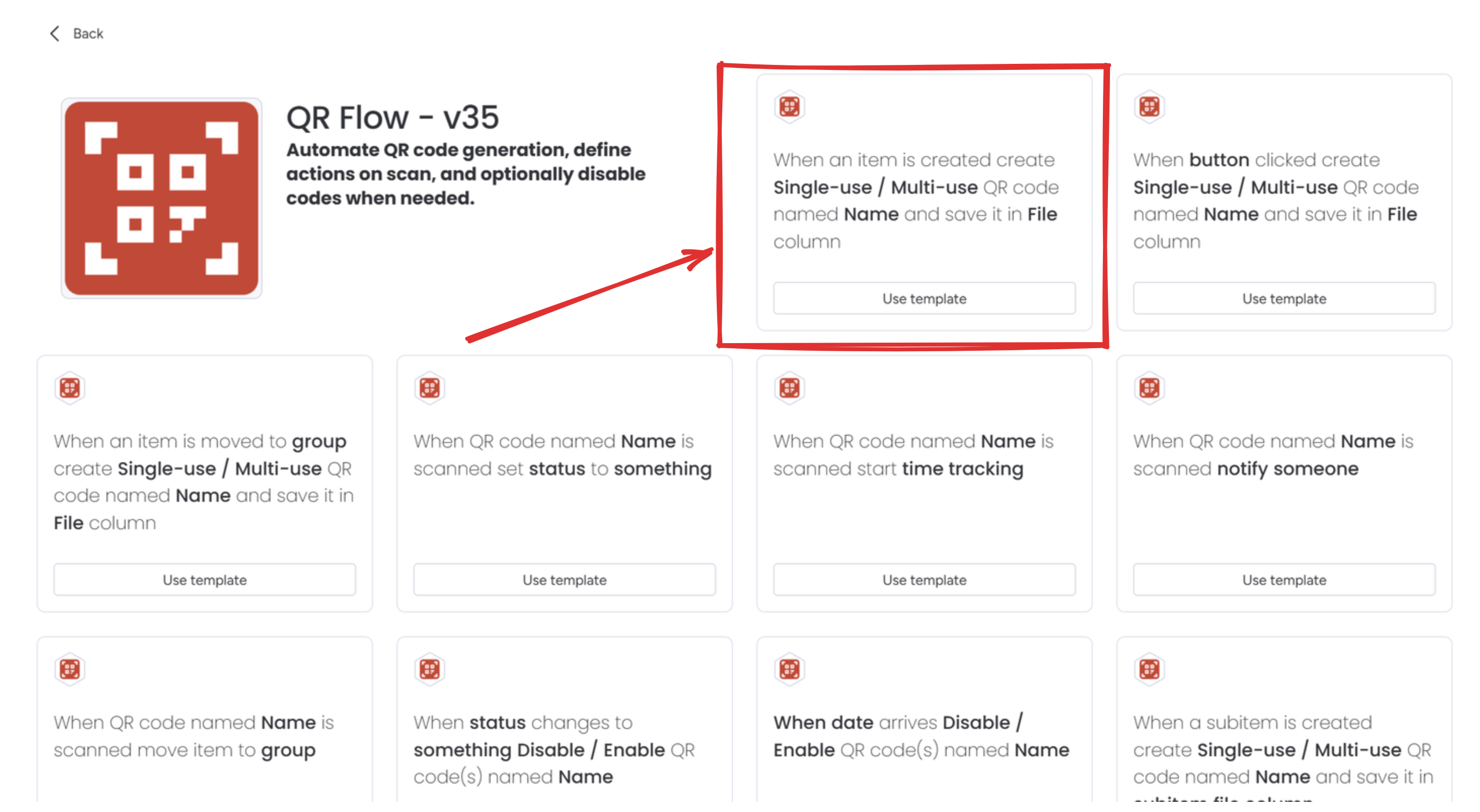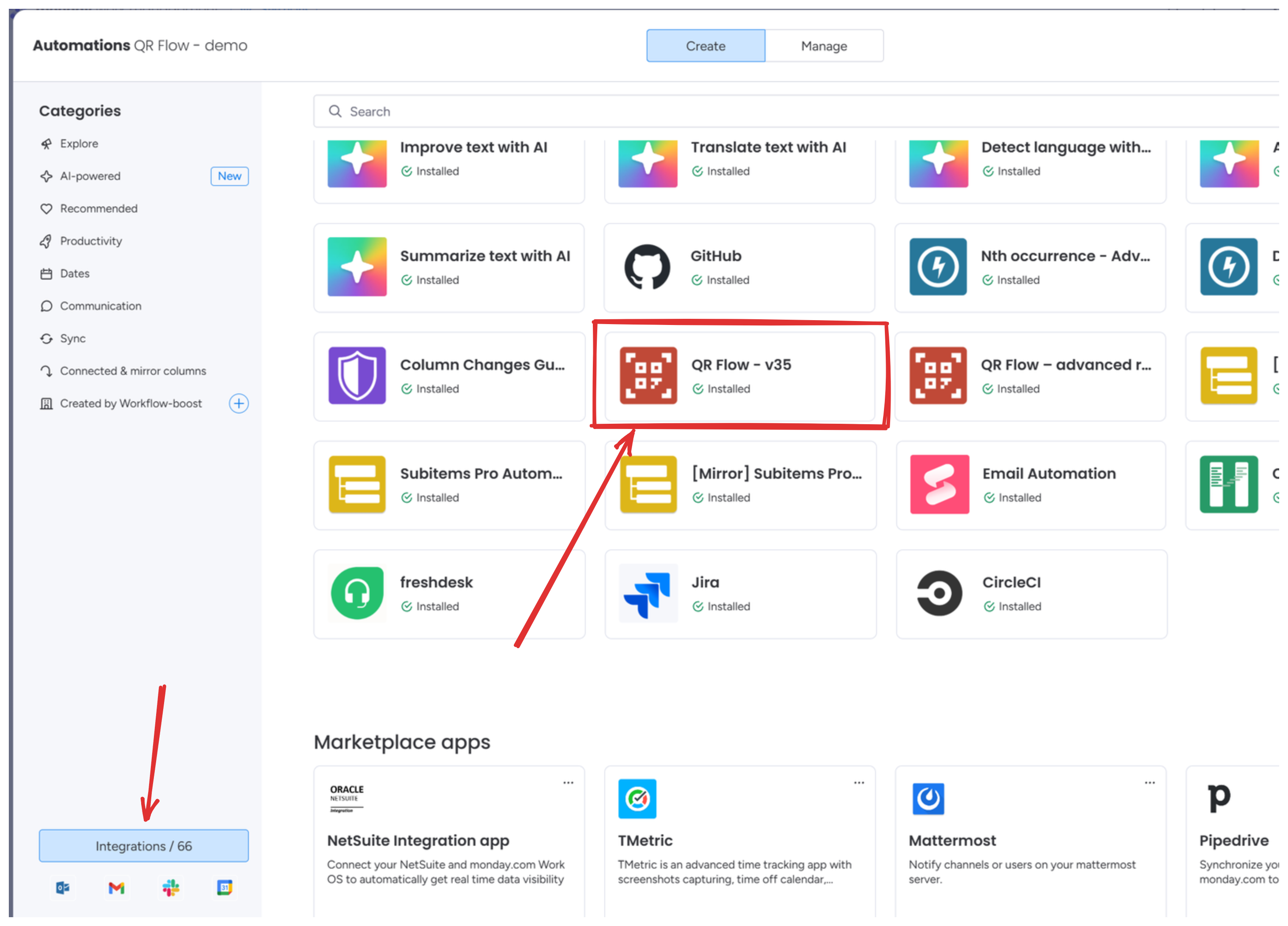 Go to your board, open the automation center. Find QR Flow in the integrations tab. Pick the QR code creation recipe.
