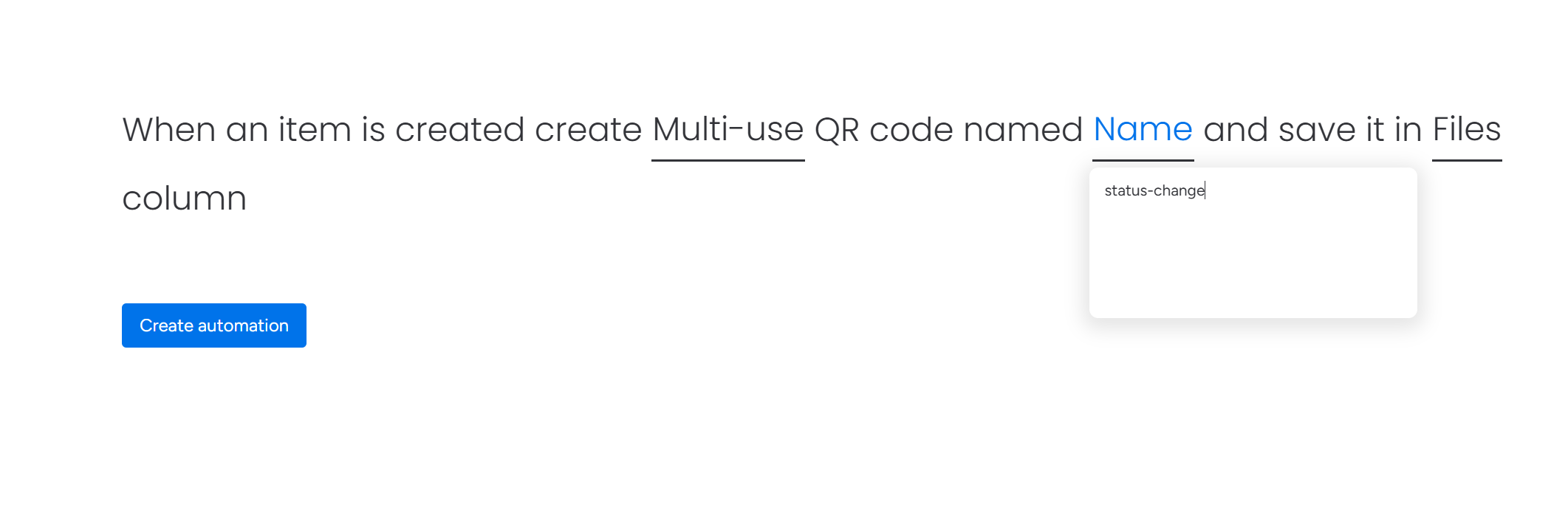The creation automation generates a QR code for each item and saves it to a file column. You pick the name, whether it's single-use or multi-use, and where the image goes.