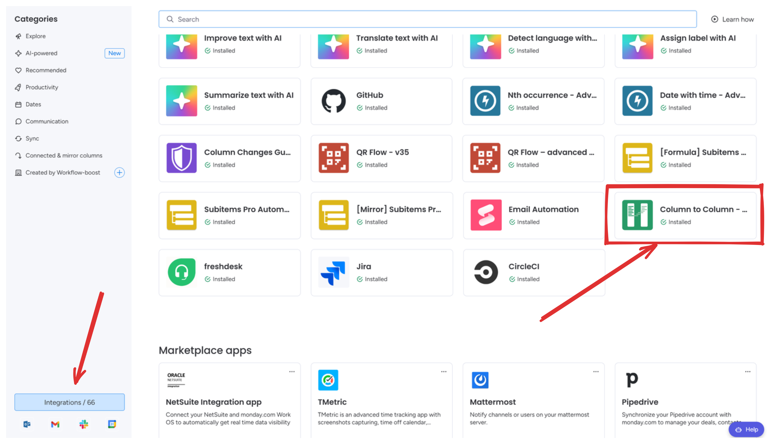 Open the monday.com marketplace, search for "Column to Column," and install it.