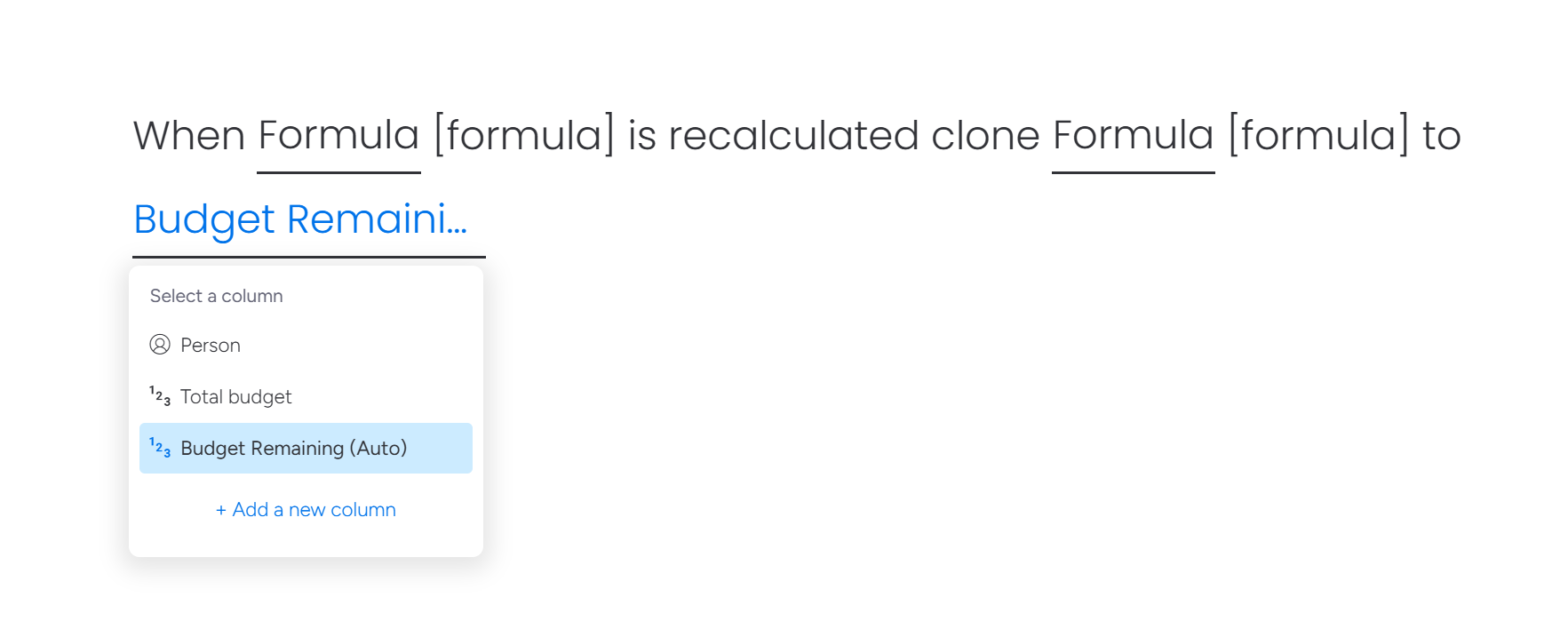 Pick your formula column, then pick (or create) a destination column to receive the result. I usually name it something like "Budget Remaining (Auto)" so it's obvious this column is automation-driven.
