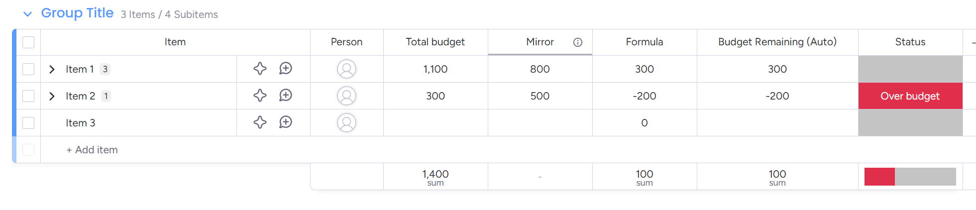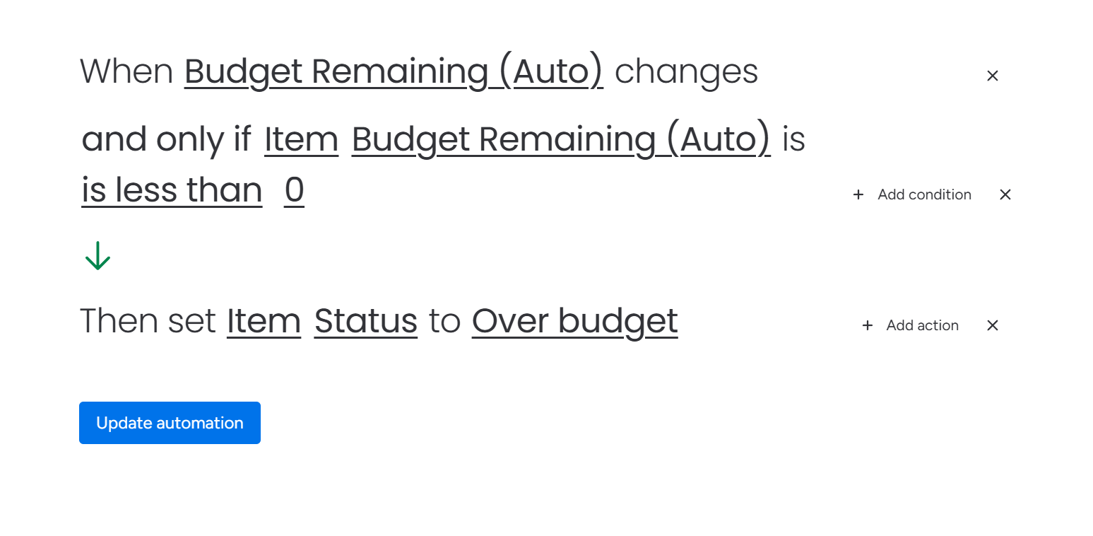 - "When Budget Remaining (Auto) is less than 0, change Status to Over Budget"